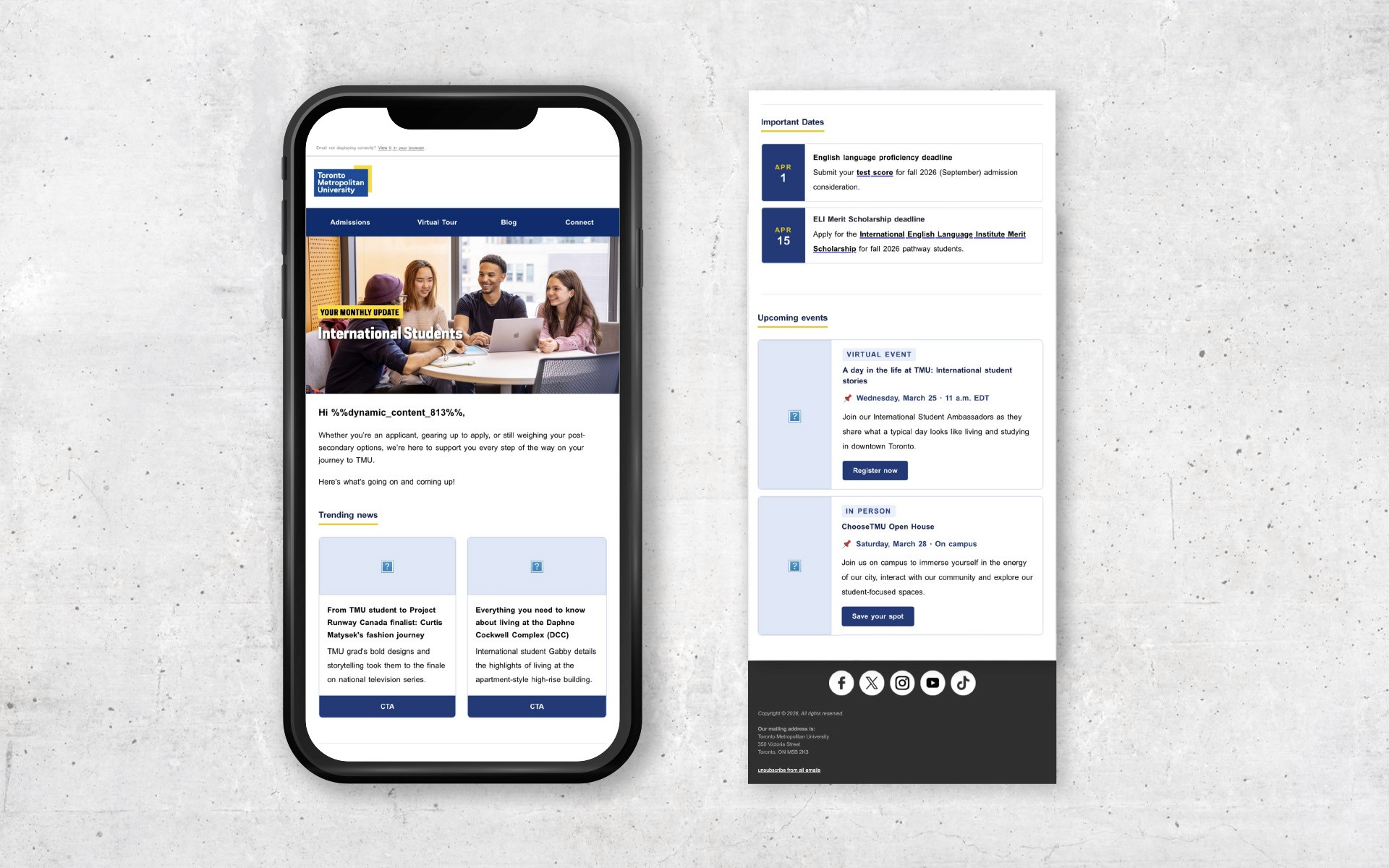 Newsletter redesign for TMU Global's monthly outreach to prospective international students.