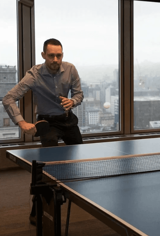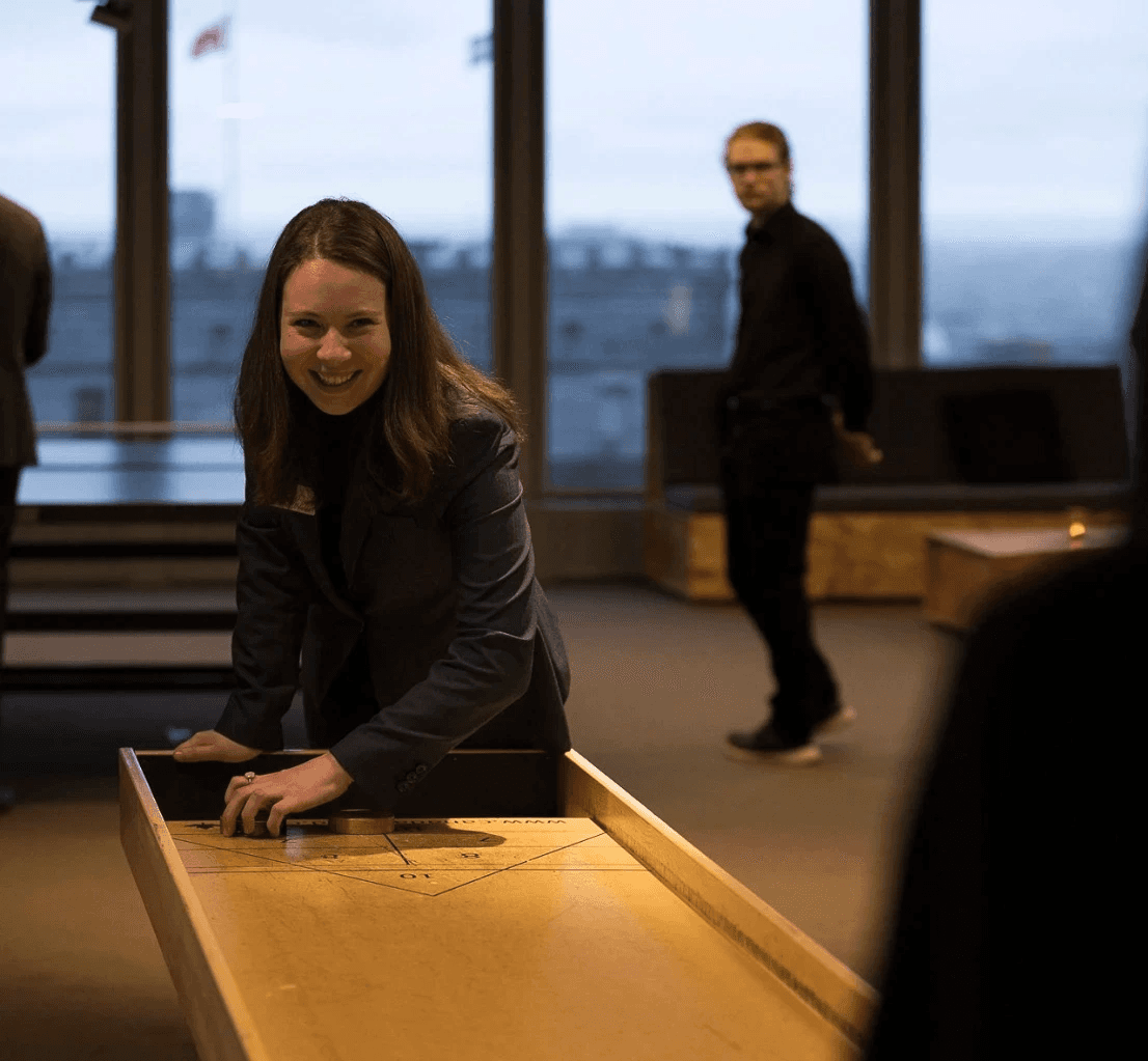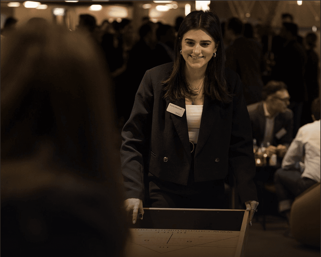Event moments featuring associates and clients enjoying table sports, wine tasting, and professional networking. The warm lighting and sophisticated tones reflect the Sports et Divertissements inspired theme.